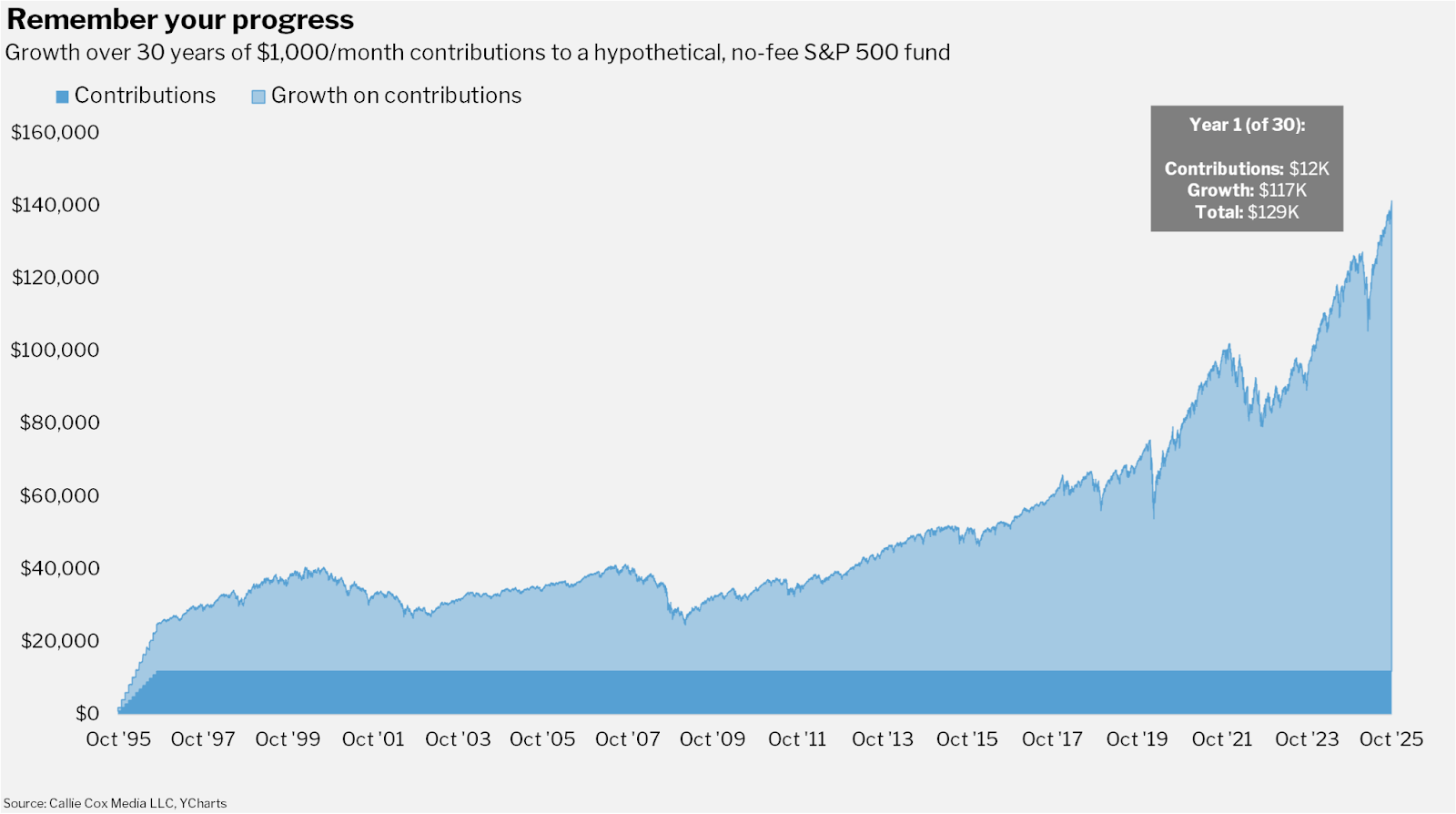 Letās say you started investing $1,000 a month in a hypothetical, no-fee S&P 500 fund 30 years ago. Today, youād have about $1.68 million sitting in your account. The $12,000 you invested in year 1 has grown 10x to about $129,000 today, or 7.7% of the total portfolio (even though it only accounts for about 3% of the money youāve invested over the years).