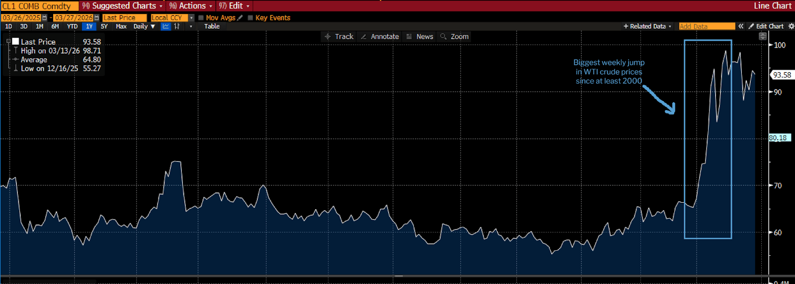 Like this ridiculous swing in oil prices, the largest in at least two and a half decades (probably longer, but that’s as far back as my data goes).