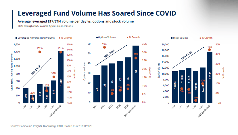 In fact, leveraged ETF and ETNs have caught fire over the last six years, with volumes growing 29% a year since the beginning of 2020. That’s almost triple the pace of stock volume growth.