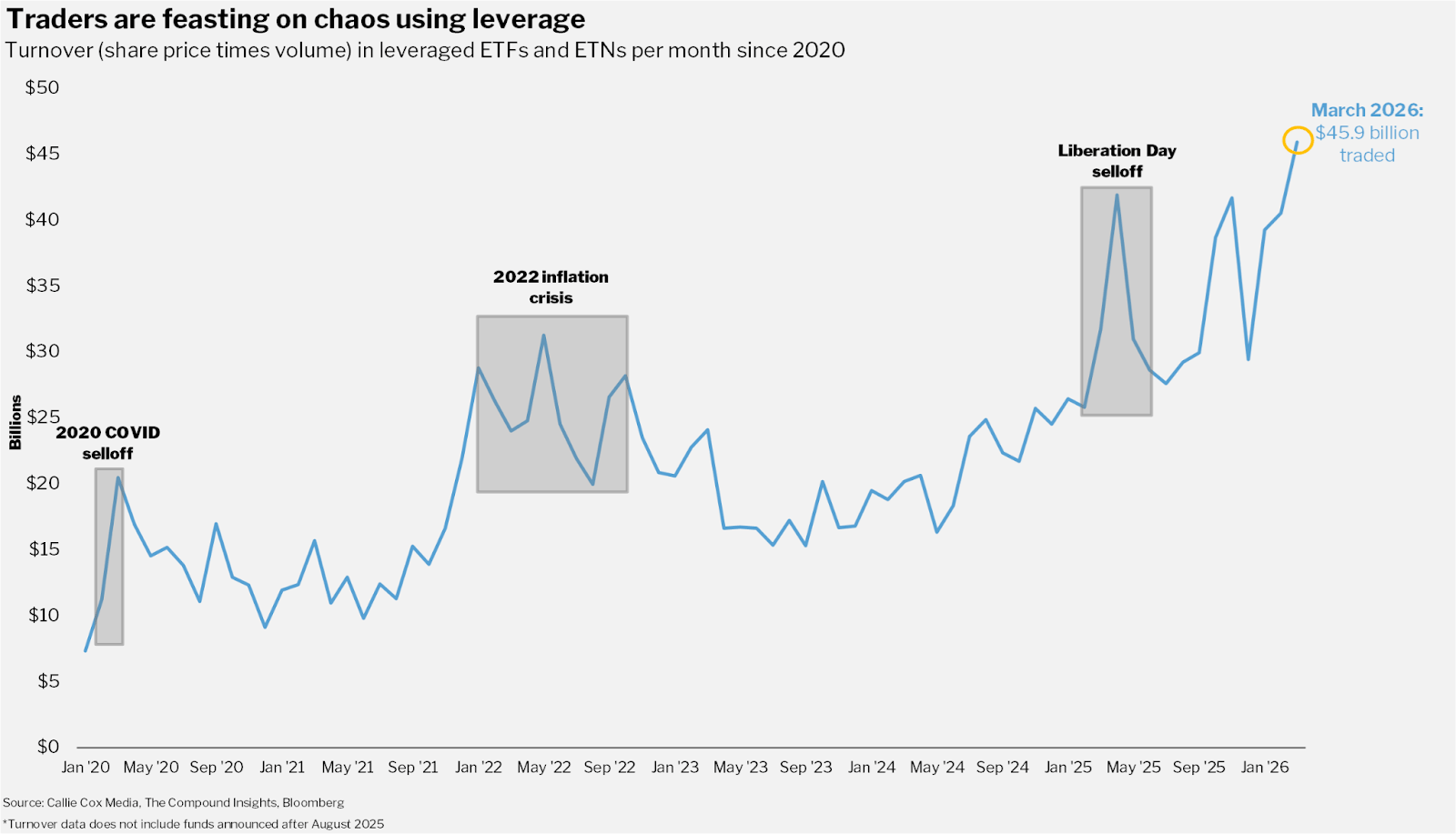 Who knew that just a handful of weeks after our research came out, we’d see record trading activity in leveraged products on the heels of the Iran conflict (and a historic surge in oil prices).